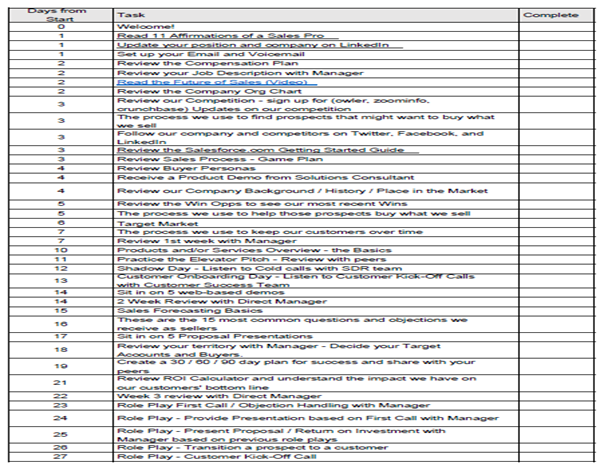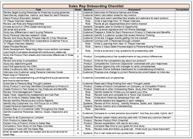 Below are two examples that can be customized (click the link to see the google sheet) to help you onboard a new Sale Rep: