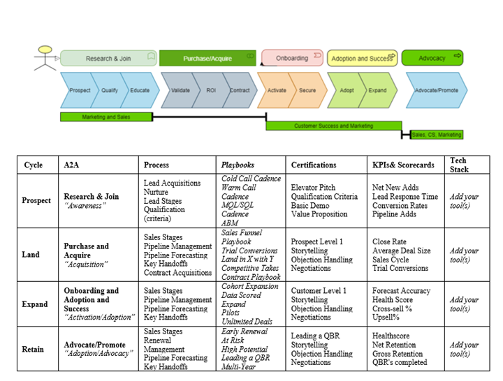 As I mentioned in Part 1 of this post, your Sales Operations Playbook is your “Primary Playbook”. As part of your Sales Operations processes, you should create and maintain “mini playbooks” for your organization. Let us take a moment to look at the A2A or Awareness to Advocacy and how Sales Operations supports the teams.