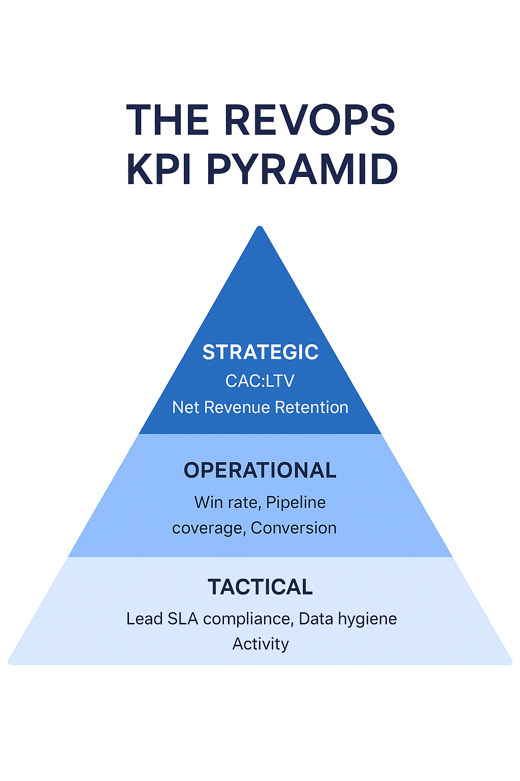 The RevOps KPI Pyramid is divided into three tiers — each with its own time horizon, purpose, and audience.